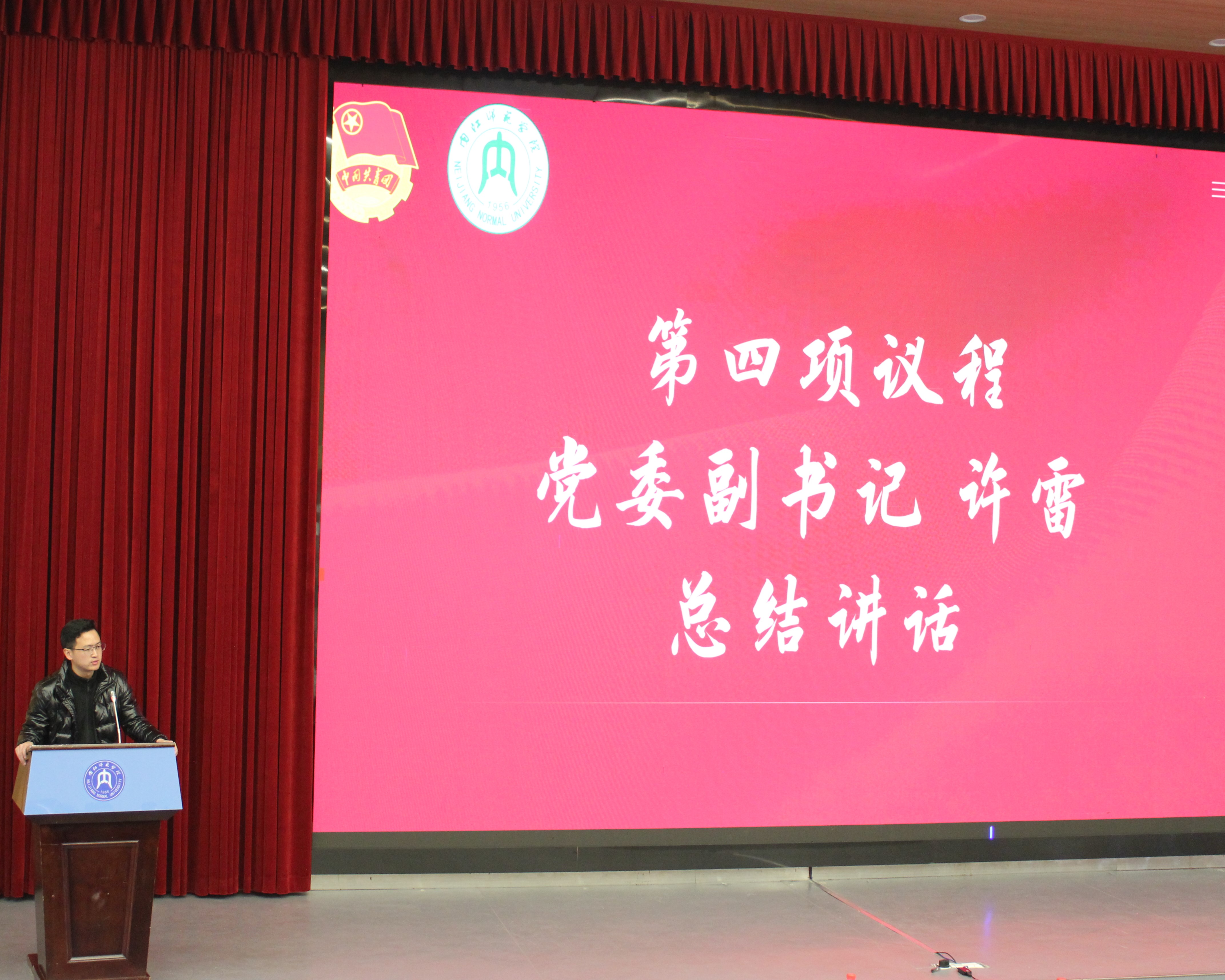 述职结束后,党委副书记许雷作指导讲话。许书记指出,团总支、学生会的工作是每个学生干部的本职工作,但作为一名学生干部,首先要抓好自身的学习,从自我做起,再通过团学影响带动更多的同学,为我院学风建设贡献自己的力量。最后,学院党委书记牟廉明作总结讲话。牟书记指出这次会议开得很扎实,各部门代表对工作的回顾客观全面,对问题的反思准确到位。他希望所有部门的学生干部要做实事、讲实话,做好各部门的本职工作,争取在新的一年取得更优异的成绩。在激扬的团歌中,本次大会落下了帷幕。